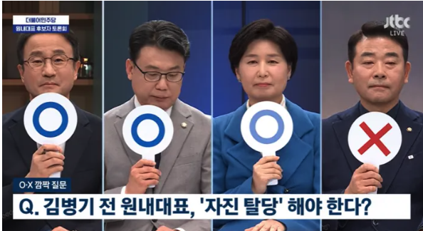 | ▲ 더불어민주당이 8일 개최한 원내대표 보궐선거 후보자 합동토론회에서 ‘김병기 전 원내대표가 자진 탈당해야 하느냐’는 질문에 한병도·진성준·백혜련 의원(맨 왼쪽부터)이 ‘O’ 팻말을, 박정 의원이 ‘X’ 팻말을 들고 있다. (출처=JTBC) |