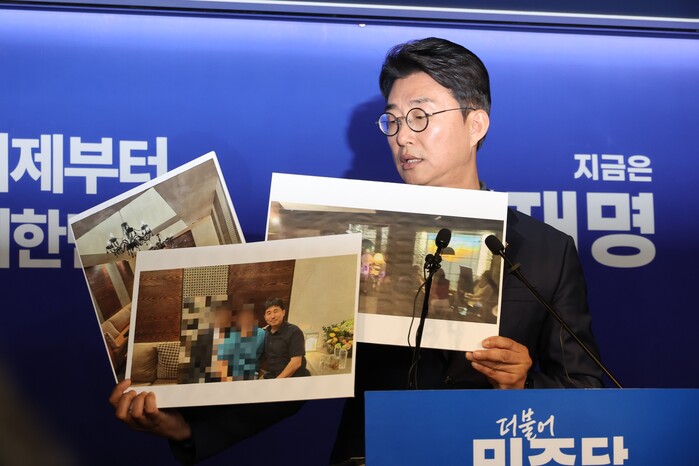 ▲ 더불어민주당 노종면 선대위 대변인이 19일 서울 여의도 당사에서 "윤석열 전 대통령의 내란 혐의 사건 재판장인 지귀연 서울중앙지법 부장판사가 유흥업소에서 접대받았다"라는 의혹을 제기하며 관련 사진을 공개하고 있다. 2025.5.19 (사진=연합뉴스)