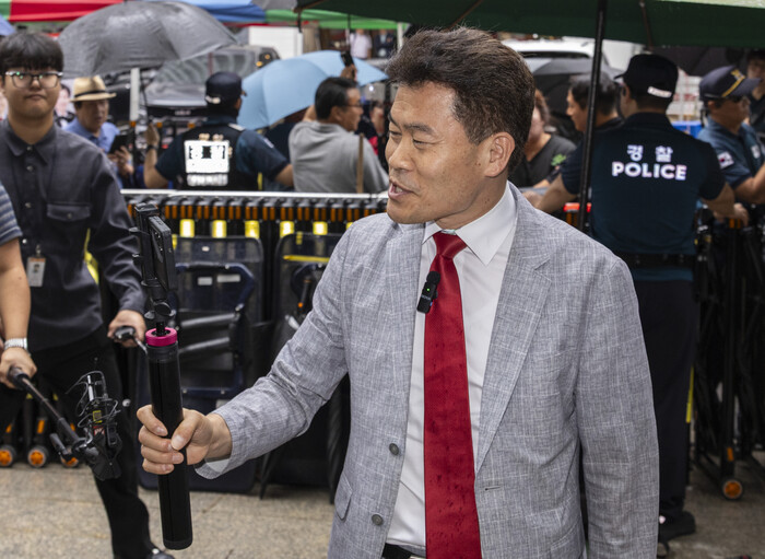 ▲ 국민의힘 전당대회 합동연설회를 방해해 당 윤리위원회에 회부된 한국사 강사 전한길 씨가 2025년 8월 14일 서울 여의도 중앙당사에서 열린 윤리위에 유튜브 라이브 방송을 하며 출석하고 있다. 2025.8.14 (사진=연합뉴스)
