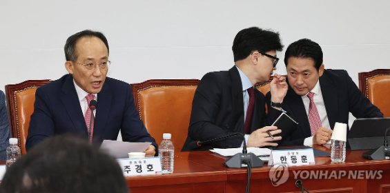 ▲ 국민의힘 한동훈 대표(가운데)가 2일 오전 국회에서 열린 최고위원회의에서 장동혁 의원과 대화하고 있다. 왼쪽은 추경호 원내대표. 2024.9.2 (사진=연합뉴스)