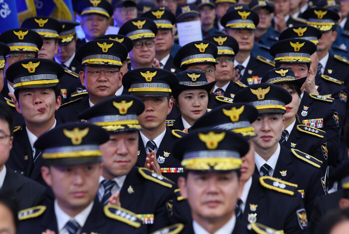 ▲ 서울 서대문구 경찰청에서 열린 80주년 경찰의 날 기념식에 참석한 경찰들이 이재명 대통령의 기념사가 끝난 뒤 박수를 치고 있다. 2025.10.21 (사진=연합뉴스)