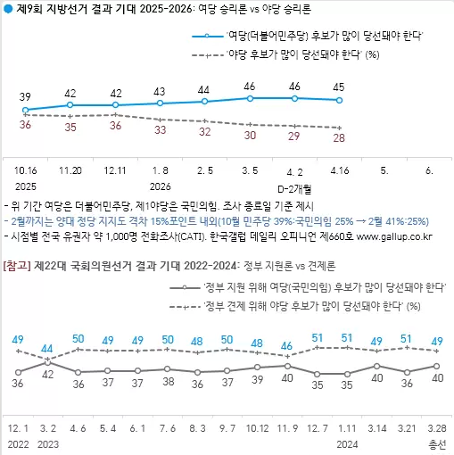 한편 6·3 지방선거 전망 조사에서는 ‘여당 후보가 많이 당선돼야 한다’는 응답이 45%, ‘야당 후보가 많이 당선돼야 한다’는 응답은 28%로 나타났다. 격차는 17%포인트로, 최근 들어 점차 확대되는 흐름이다.
