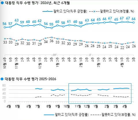 한국갤럽이 4월 14일부터 16일까지 전국 만 18세 이상 1000명을 대상으로 실시한 조사 결과, 이 대통령의 직무수행 긍정 평가는 66%, 부정 평가는 26%로 집계됐다. 유보 응답은 8%였다.