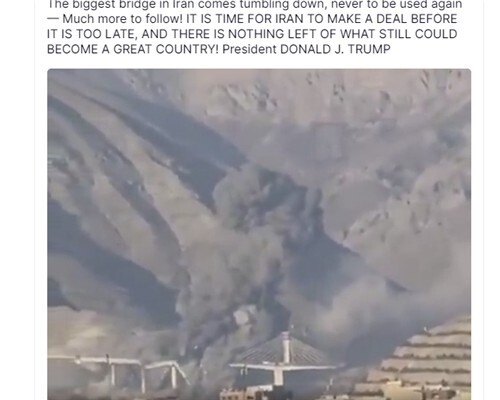| ▲ 트럼프 대통령이 올린 교량 폭파 영상 캡처 (사진=연합뉴스) |
