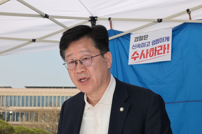 | ▲ 6·3 지방선거 더불어민주당 전북지사 경선에서 이원택 의원에게 패배한 후 이 후보의 '식사비 대납' 의혹에 대한 재감찰을 요구하며 단식 농성을 벌이고 있는 안호영 의원이 15일 국회 본청 앞 농성장에서 입장 발표를 하고 있다. 2026.4.15 (사진=연합뉴스) |