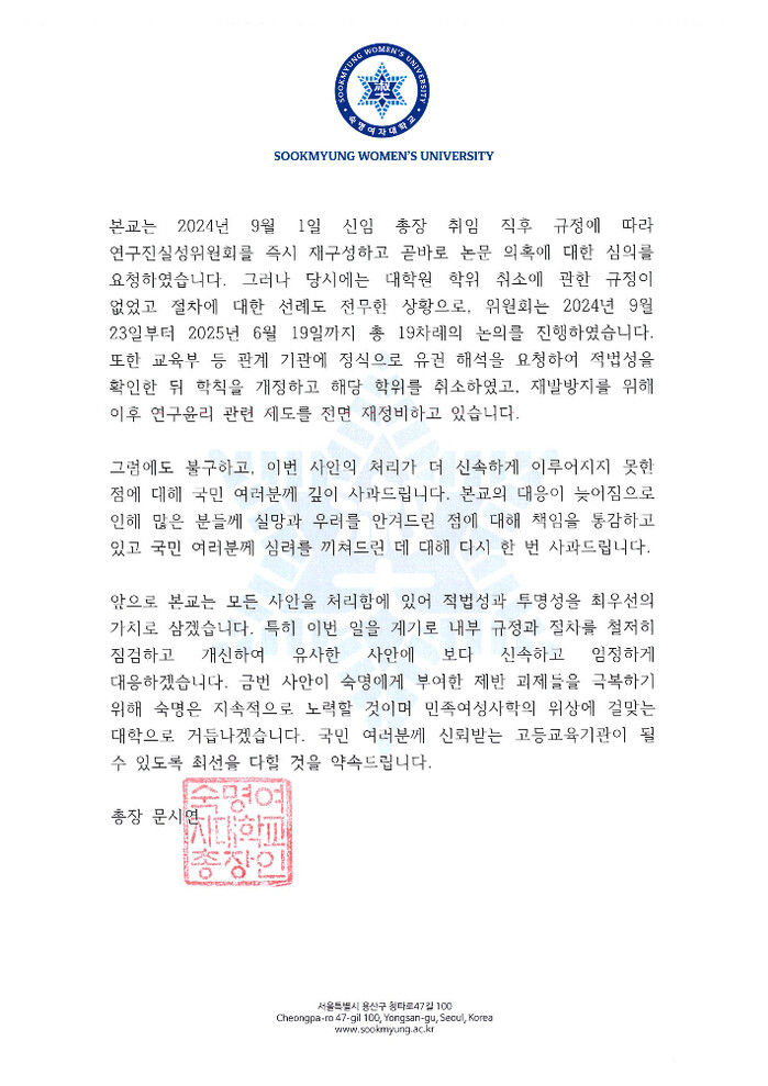 숙명여대 문시연 총장은 3일 학교 홈페이지에 올린 입장문에서 “이번 사안 처리가 신속하게 이뤄지지 못한 점에 대해 국민께 깊이 사과드린다”며 “본교 대응이 늦어지면서 많은 분들께 실망과 우려를 안겨드린 점에 대해 책임을 통감한다”고 밝혔다.