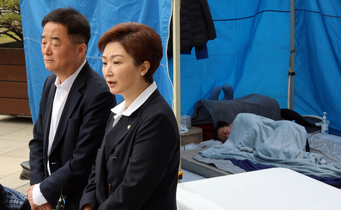▲ 더불어민주당 강득구·이언주 최고위원이 22일 국회 본청 앞에서 단식 12일 차를 맞은 안호영 의원의 천막 농성장을 찾아 기자회견을 하고 있다. 2026.4.22 (사진=연합뉴스)