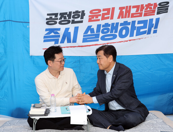 ▲ 더불어민주당 전북지사 경선에서 이원택 후보에게 패배 후 '제3자 식비 대납 의혹'과 관련해 재감찰을 요구하며 단식 중인 안호영 의원(왼쪽)이 13일 국회 본청 앞 단식 농성장을 찾은 김관영 전북도지사를 만나 얘기를 나누고 있다. 2026.4.13 (사진=연합뉴스)