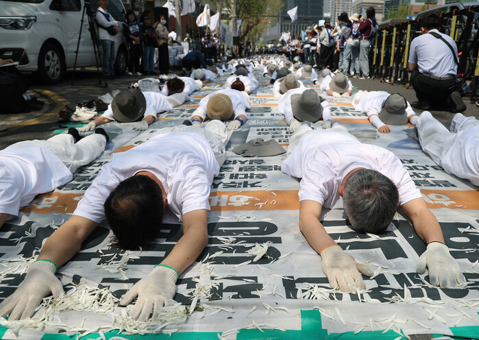 | ▲ 전국장애인부모연대가 15일 서울 서대문구 경찰청 앞에서 연 '고(故) 김창민 영화감독 상해치사 사건 부실수사 규명 촉구 오체투지'에서 참가자들이 오체투지를 하고 있다. 2026.4.15 (사진=연합뉴스) |