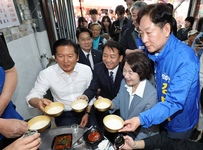 | ▲ 더불어민주당 정청래 대표와 추미애 경기지사 후보, 이광재 하남갑 보궐선거 후보, 강병덕 하남시장 후보가 29일 경기도 하남 덕풍전통시장을 찾아 건배하고 있다. 2026.4.29 (사진=연합뉴스) |
