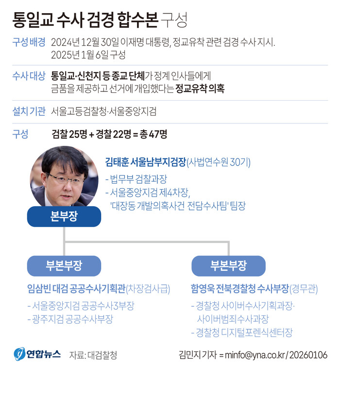 통일교·신천지 정교유착 비리 의혹을 수사할 검찰·경찰 합동수사본부가 총 47명 규모로 공식 출범했다. 본부장은 김태훈 서울남부지검장(사법연수원 30기)이 맡는다.