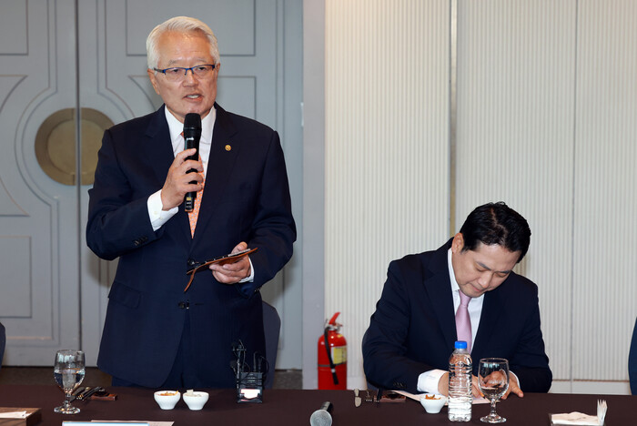 ▲ 민의힘 장동혁 대표(오른쪽)가 13일 서울 영등포구 여의도 한 중식당에서 열린 국민의힘 상임고문단 회의에 참석해 고문단 회장인 정의화 전 국회의장의 발언을 메모하고 있다. 2025.10.13 (사진=연합뉴스) |