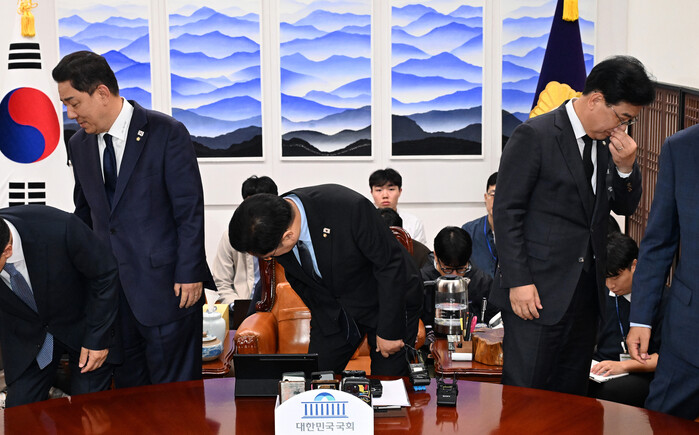 ▲ 더불어민주당 김병기 원내대표(왼쪽)과 국민의힘 송언석 원내대표가 13일 국회에서 우원식 국회의장 주재로 열린 여야 교섭단체 원내대표 회동에서 만나 자리에 앉고 있다. 2025.10.13 (사진=연합뉴스) |