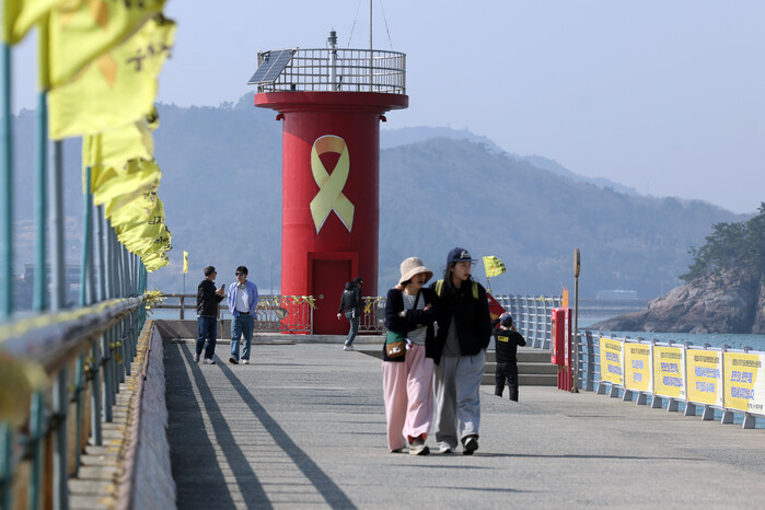 | ▲ 세월호 참사 12주기를 19일 앞둔 28일 전남 진도 임회면 팽목항에서 한 가족이 등대와 현수막을 둘러보고 있다. 2026.3.28 (사진=연합뉴스) |