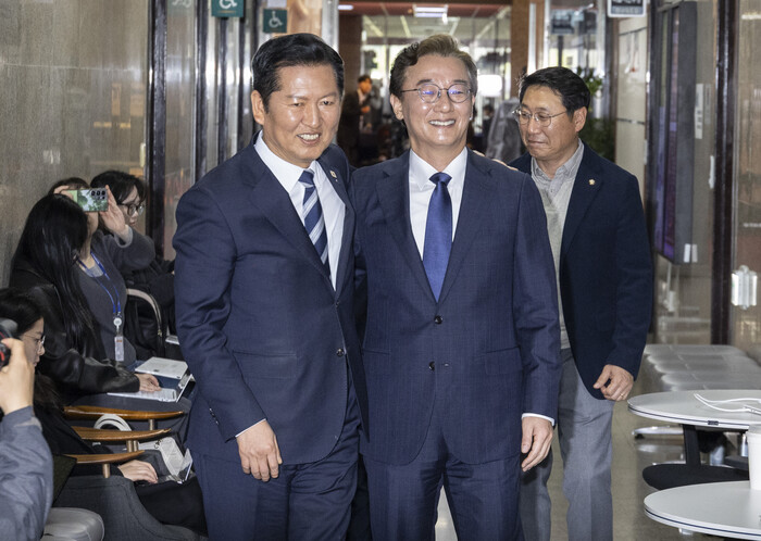 | ▲ 더불어민주당 정청래 대표(왼쪽)가 10일 국회에서 6ㆍ3 지방선거 민주당 부산시장 후보로 확정된 전재수 의원과 만나 당 대표실로 이동하고 있다. 2026.4.10 (사진=연합뉴스) |