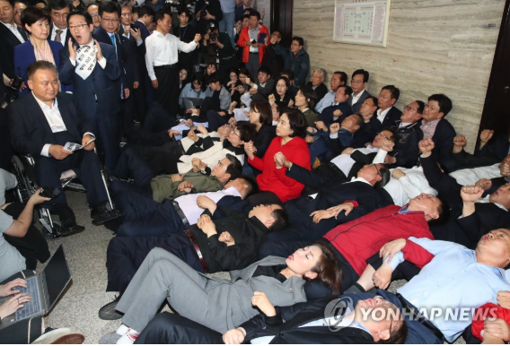 | ▲ 나경원 원내대표 등 자유한국당 의원들이 사법개혁특위가 열리는 국회 회의실 앞에 드러누워 이상민 위원장 등 참석자 진입을 막는 모습. 2019.4.26 (사진=연합뉴스) |
