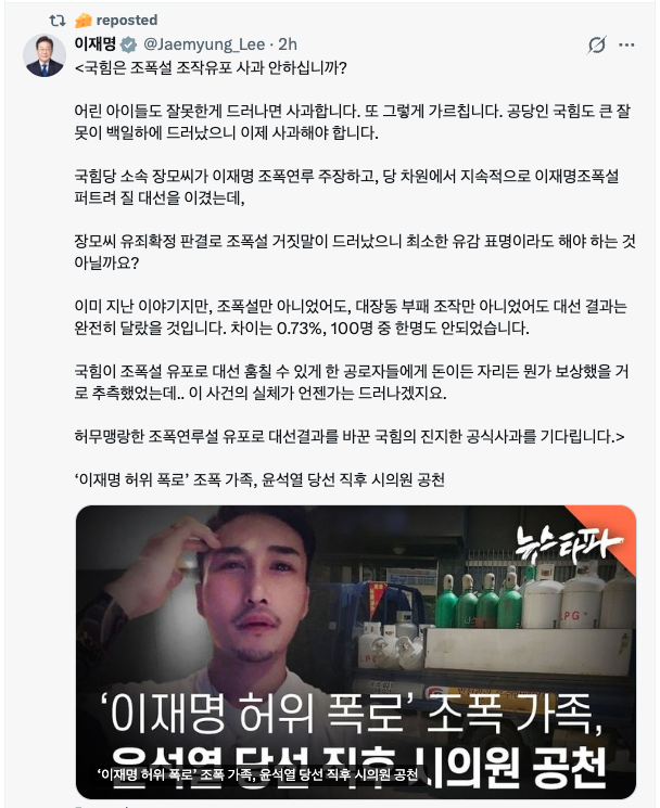 이 대통령은 15일 자신의 사회관계망서비스(SNS)에 ‘국힘은 조폭설 조작유포 사과 안 하십니까?’라는 제목의 글을 올리고 “공당인 국힘도 큰 잘못이 백일하에 드러났으니 이제 사과해야 한다”고 밝혔다.