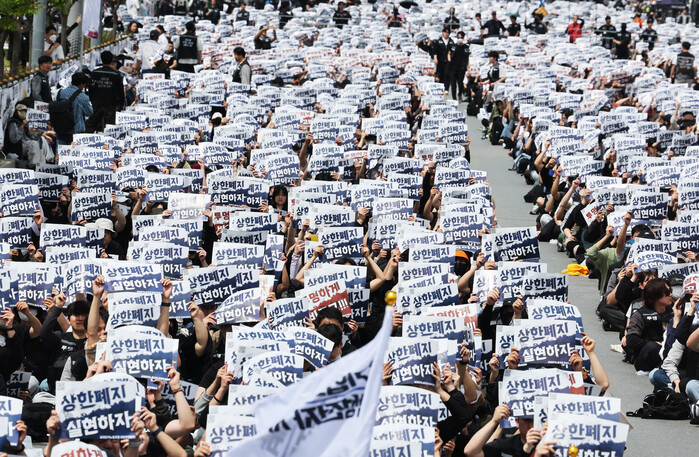 | ▲ 23일 경기도 평택시 삼성전자 평택캠퍼스 앞에서 열린 삼성전자 노동조합 공동투쟁본부의 '투명하게 바꾸고, 상한폐지 실현하자-4/23 투쟁 결의대회'에서 조합원들이 구호를 외치고 있다. 2026.4.23 (사진=연합뉴스) |