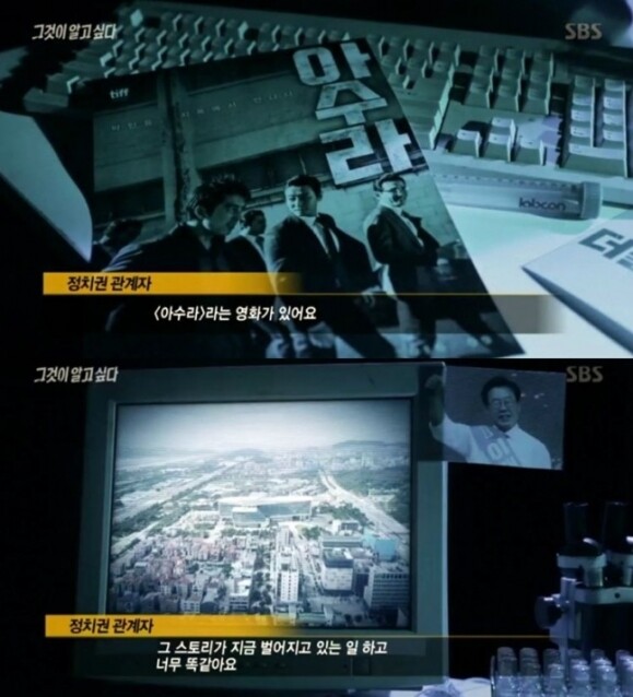 그알은 당시 이재명 경기도지사와 은수미 성남시장이 조직폭력배와 유착 관계가 있다고 보도하며 영화 ‘아수라’를 등장시켰다. 그 장면이 기폭제가 되어 미친 영향은 상상을 초월했다. 정치인이 “〈아수라〉라는 영화가 있어요. 그 스토리가 지금 벌어지고 있는 일하고 너무 똑같아요.”라고 말하는 와중에 영화 ‘아수라’ 속 박성배(황정민)의 목소리가 흘러나오고, 동시에 이재명 당시 경기도지사의 사진을 상단에 배치했다.