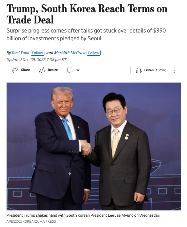 월스트리트저널(WSJ)도 “수개월간 줄다리기 끝에 전격 타결됐다”며, 이번 합의가 다른 국가들의 무역 협상에도 기준점이 될 수 있다고 언급했다.