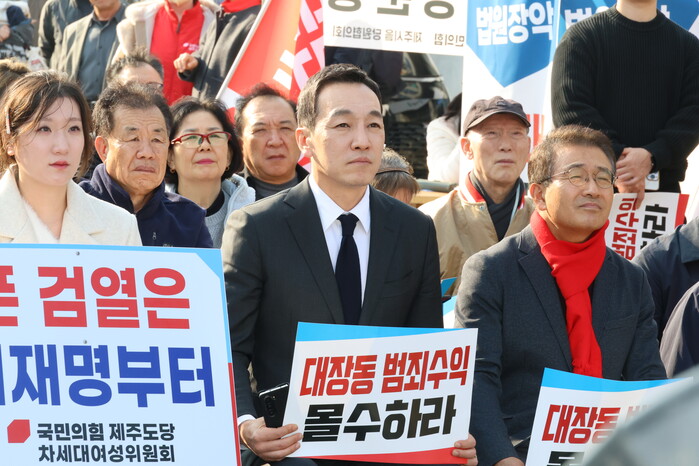 | ▲ 제주시청 앞에서 열린 이재명 정부를 비판하는 국민의힘 전국 순회 장외집회에서 김민수 최고위원이 손팻말을 들고 있다. 2025.12.7 (사진=연합뉴스) |